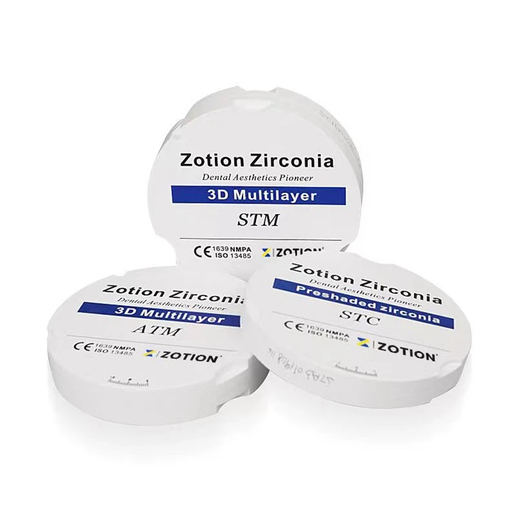 A Zotion számos típusú cirkóniával rendelkezik, beleértve a fehér cirkónium blokkot (HT:>1200mpa áttetszőség:41%,ST:>900mpa áttetszőség:43%), az előre árnyékolt cirkóniumblokkot (STC:>900mpa áttetszőség:43%,HTC:>1200mpa áttetszőség:4%), 3rconia:4 többrétegű blokk (STM:800mpa-1100mpa Átlátszóság:43%-49%,ATM:600mpa-900mpa Átlátszóság:46%-55%),3D többrétegű előárnyékolt cirkónia blokk (TSTM:800mpa-1100mpa Átlátszóság:43%-49%,TATM:600mpa-5 9%-60mpa-tal 0%) A cirkónium blokk nagy szilárdságú, jó áttetszőséggel és természetes színnel rendelkezik. A Zotion cirkónia CE és ISO tanúsítvánnyal rendelkezik, és a világ több mint 120 országában értékesítették.